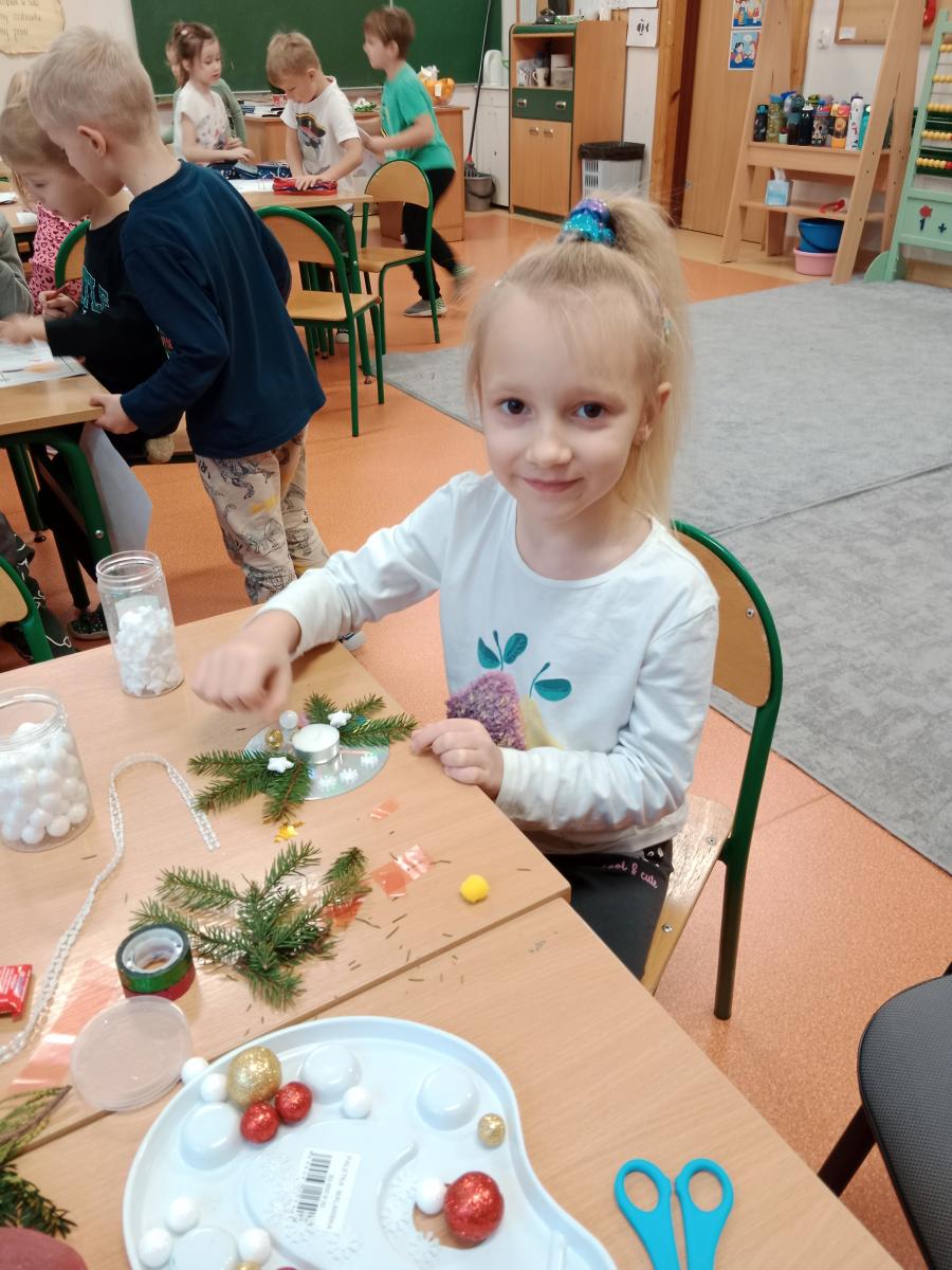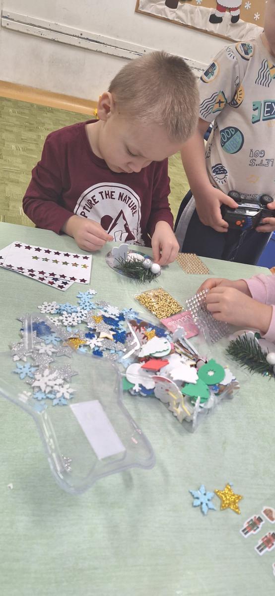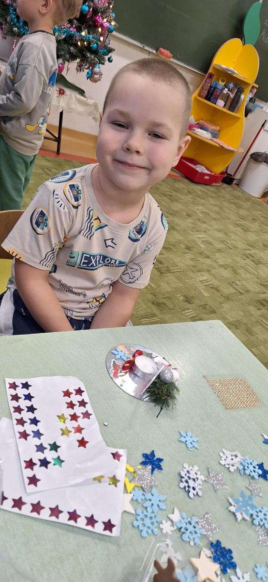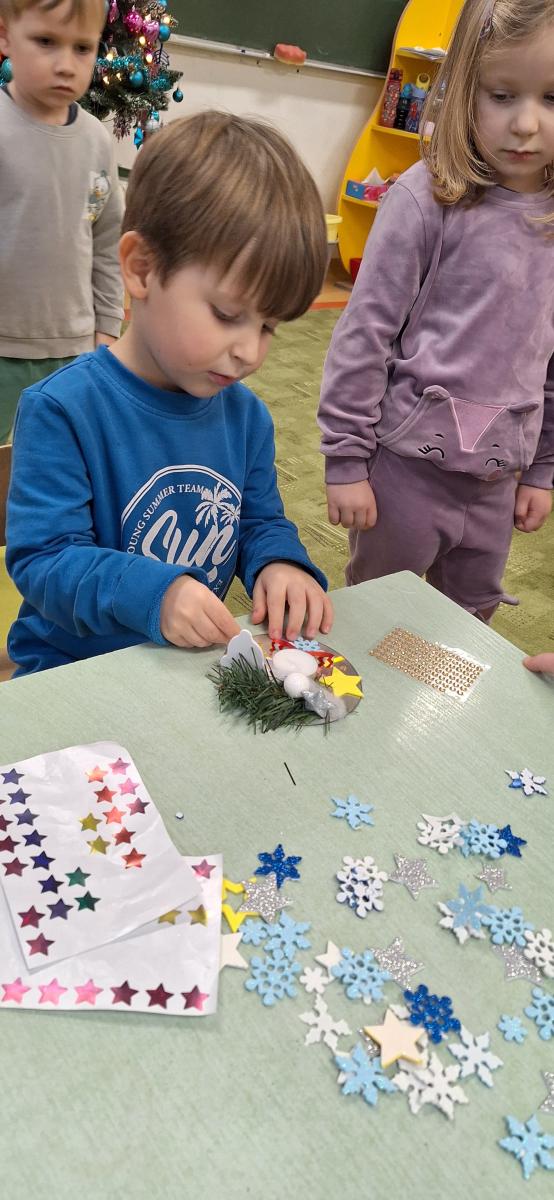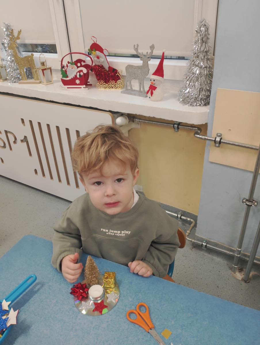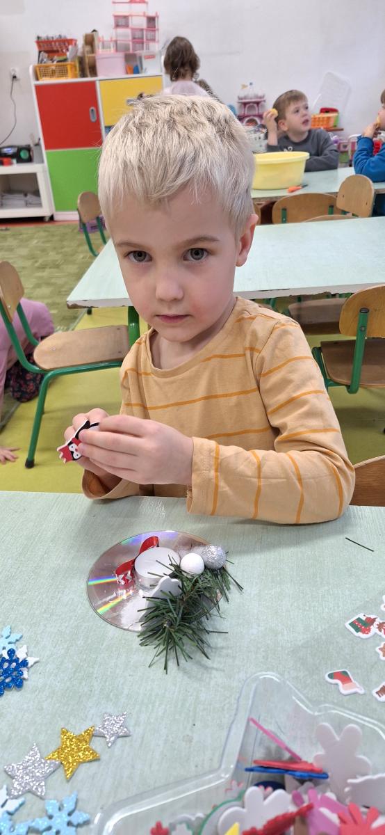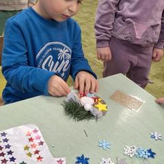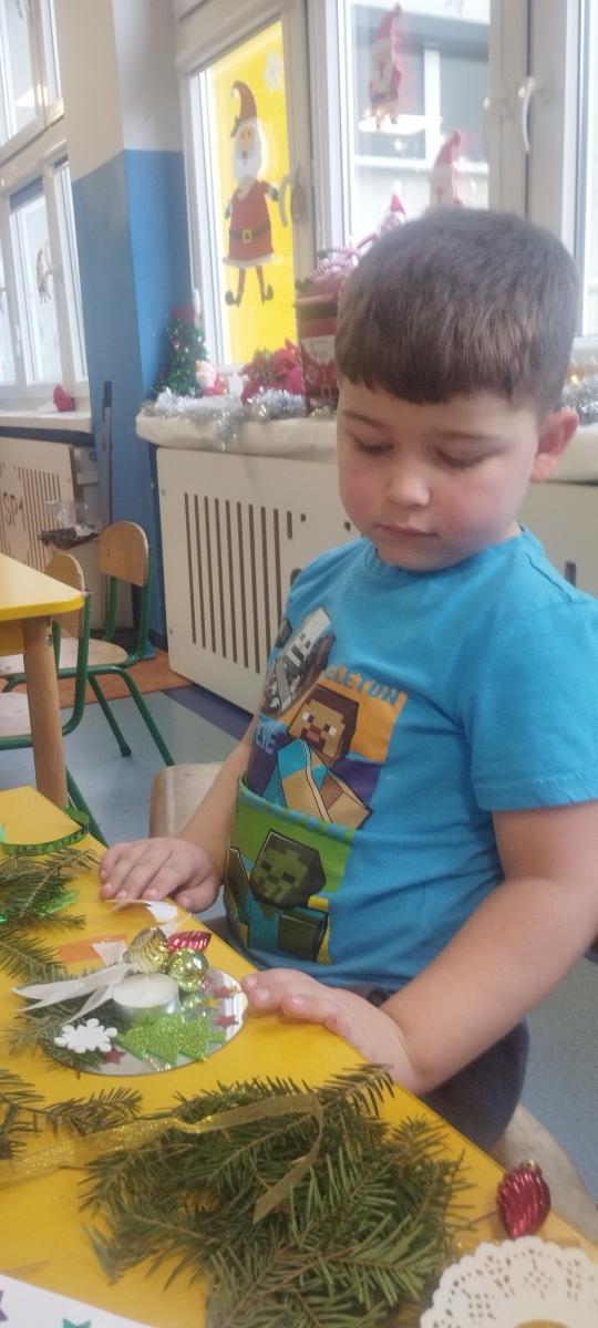 Święta Bożego Narodzenia to doskonała okazja, aby zaangażować dzieci do twórczego działania i wprowadzić je w magiczną atmosferę przygotowań do świąt. W dniu 09.12.2025 r., w ramach innowacji pedagogicznej „Świat małego artysty”, przedszkolaki wykonały świąteczny stroik, zaopatrzony w kolorowe wstążki, gałązki jodłowe i ozdoby. To była nie tylko okazja do rozwijania zdolności manualnych, ale także do wyrażania swojej kreatywności i indywidualności poprzez układanie elementów ozdobnych. Dzieci z zaangażowaniem i entuzjazmem dobierały kolorystykę, decydowały o rozmieszczeniu ozdób, tworząc małe arcydzieła świątecznej sztuki. Efekty pracy były wspaniałe, stroiki wypełnione były świątecznym blaskiem i magią.
