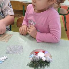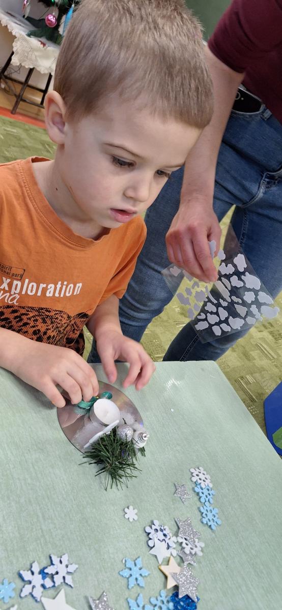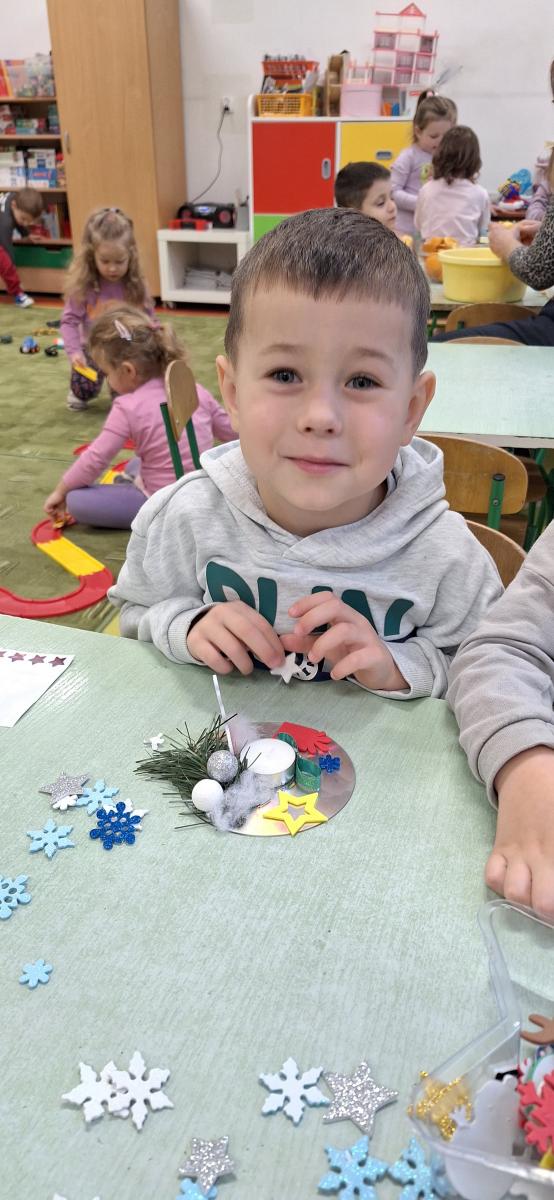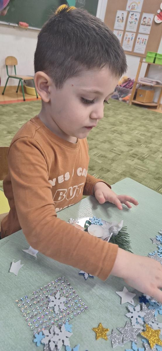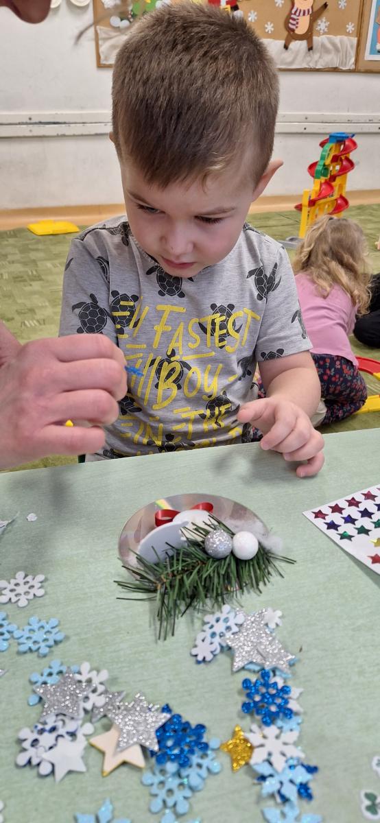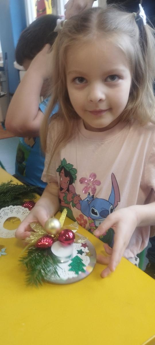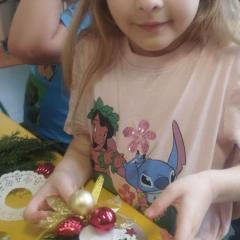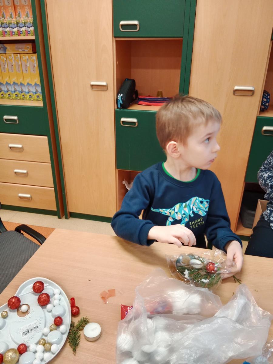 Święta Bożego Narodzenia to doskonała okazja, aby zaangażować dzieci do twórczego działania i wprowadzić je w magiczną atmosferę przygotowań do świąt. W dniu 09.12.2025 r., w ramach innowacji pedagogicznej „Świat małego artysty”, przedszkolaki wykonały świąteczny stroik, zaopatrzony w kolorowe wstążki, gałązki jodłowe i ozdoby. To była nie tylko okazja do rozwijania zdolności manualnych, ale także do wyrażania swojej kreatywności i indywidualności poprzez układanie elementów ozdobnych. Dzieci z zaangażowaniem i entuzjazmem dobierały kolorystykę, decydowały o rozmieszczeniu ozdób, tworząc małe arcydzieła świątecznej sztuki. Efekty pracy były wspaniałe, stroiki wypełnione były świątecznym blaskiem i magią.