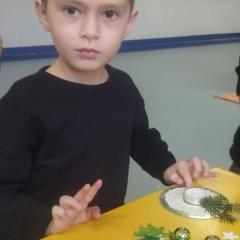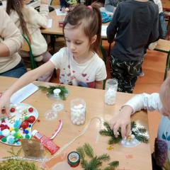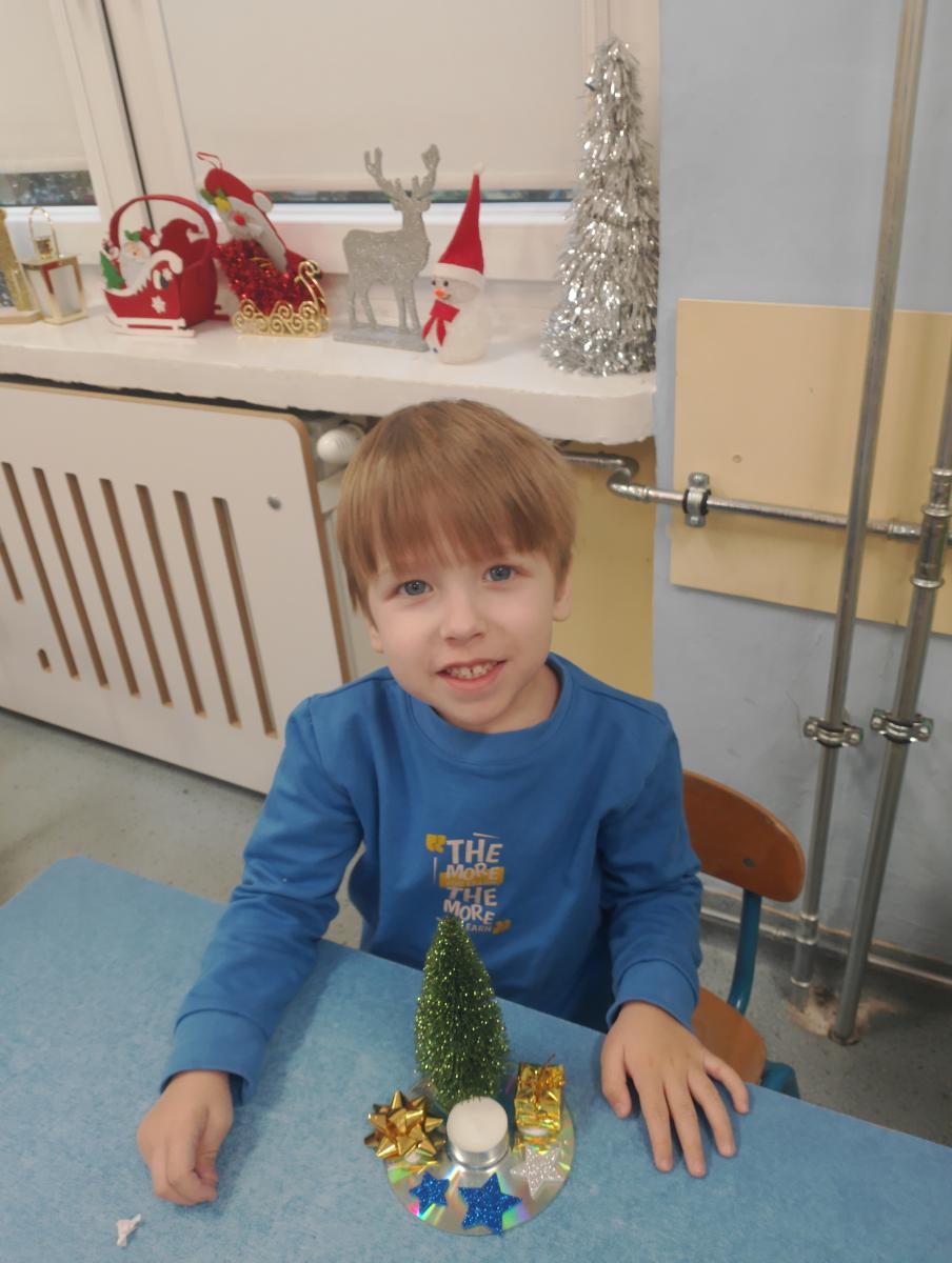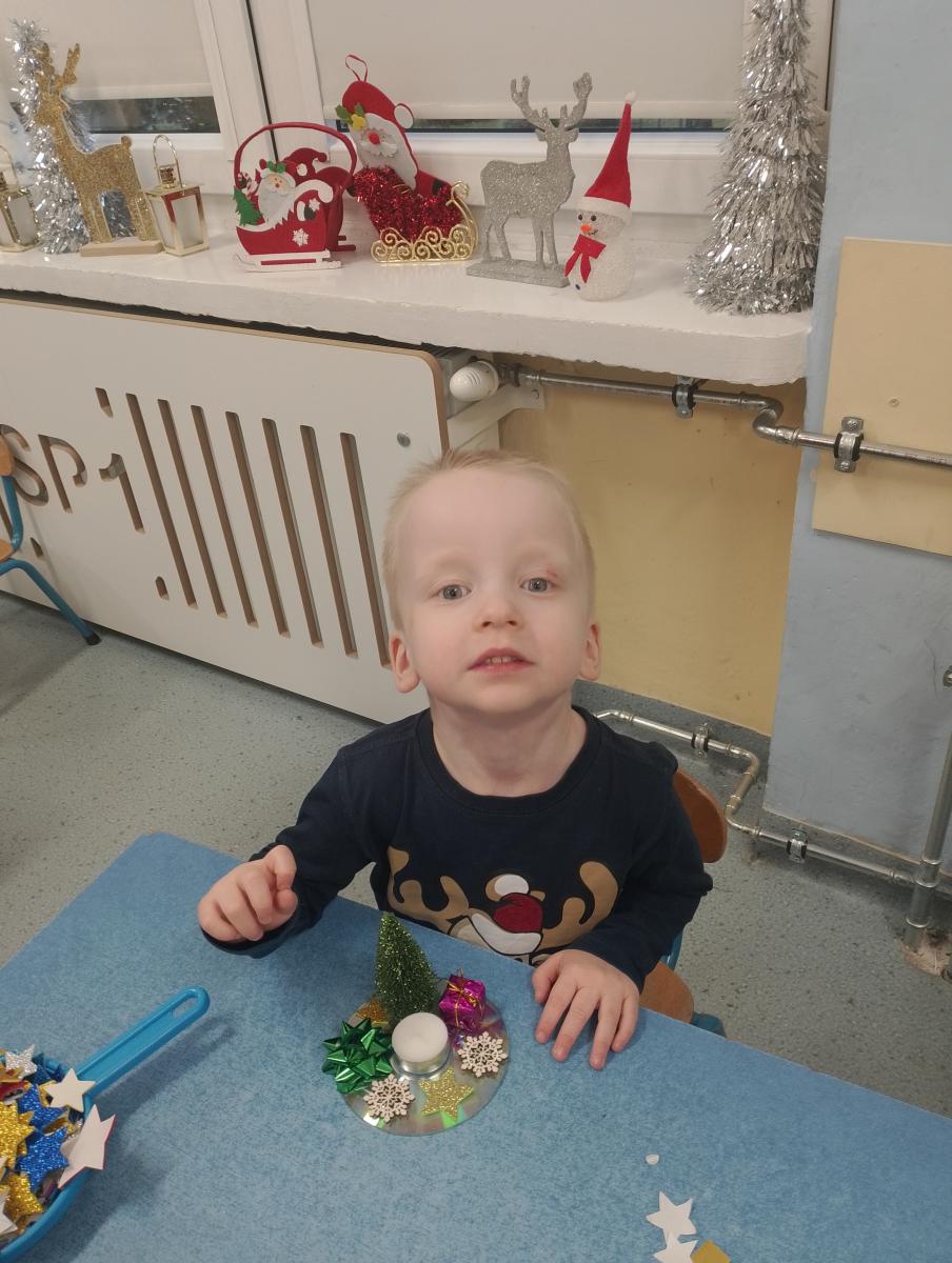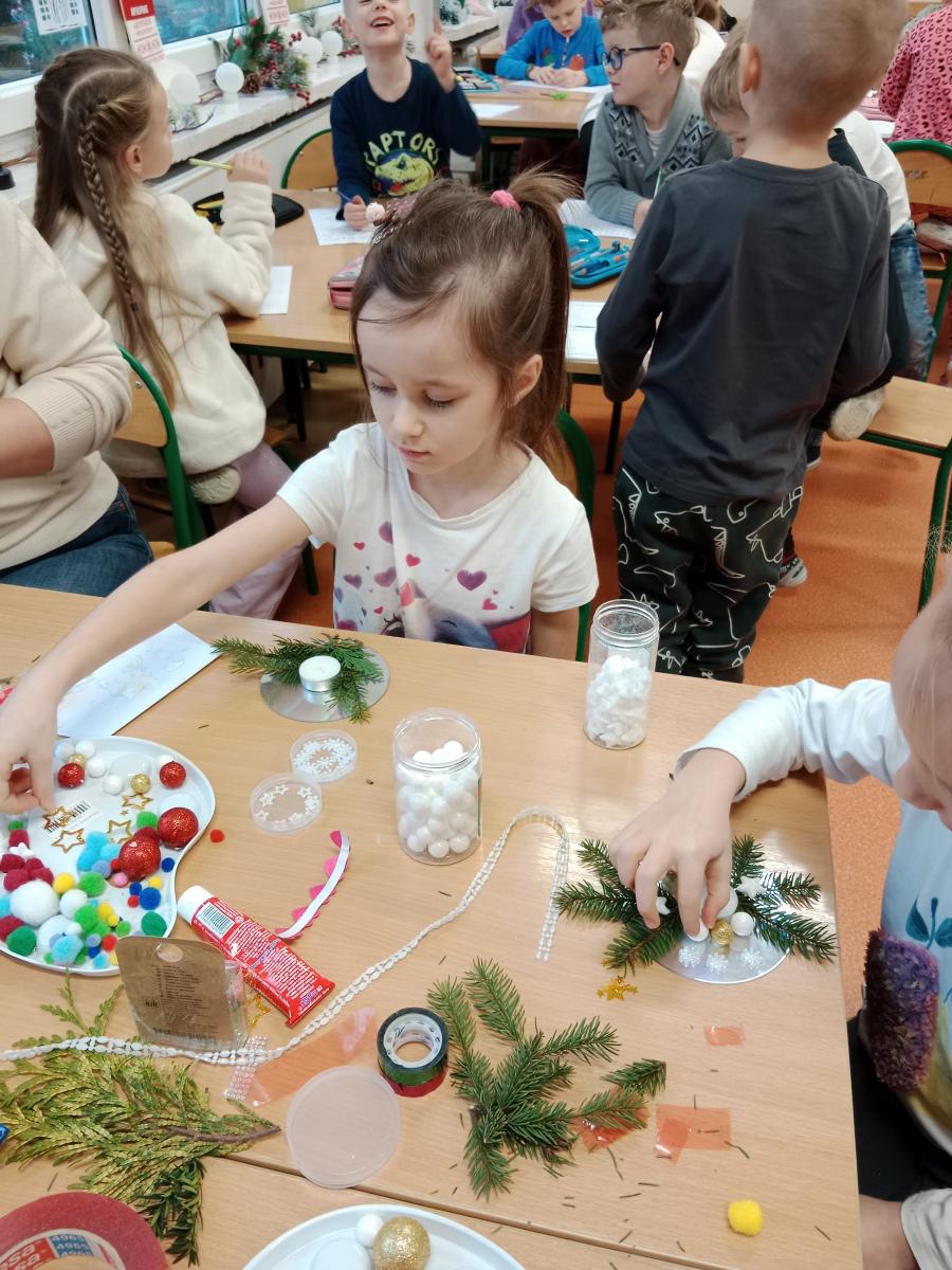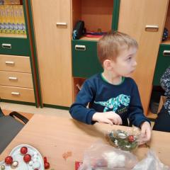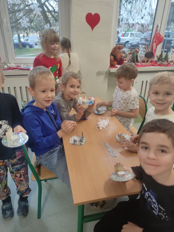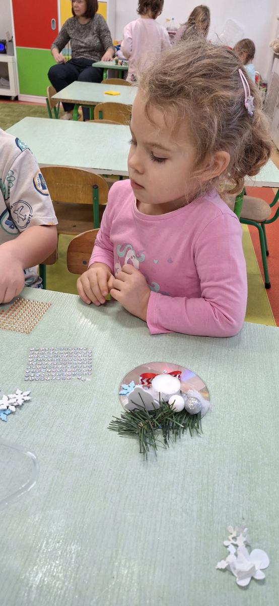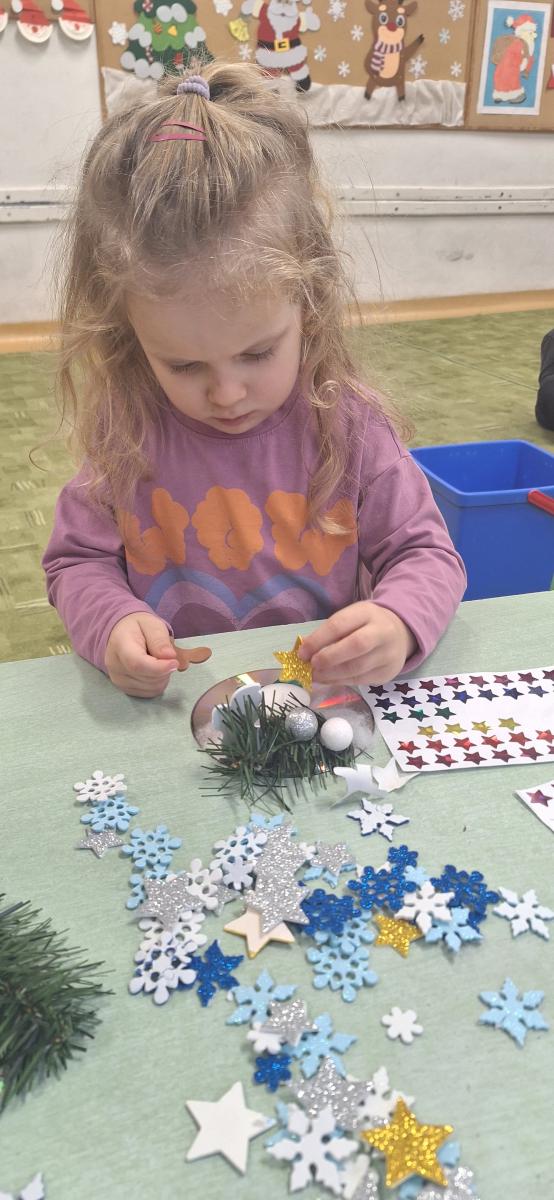 Święta Bożego Narodzenia to doskonała okazja, aby zaangażować dzieci do twórczego działania i wprowadzić je w magiczną atmosferę przygotowań do świąt. W dniu 09.12.2025 r., w ramach innowacji pedagogicznej „Świat małego artysty”, przedszkolaki wykonały świąteczny stroik, zaopatrzony w kolorowe wstążki, gałązki jodłowe i ozdoby. To była nie tylko okazja do rozwijania zdolności manualnych, ale także do wyrażania swojej kreatywności i indywidualności poprzez układanie elementów ozdobnych. Dzieci z zaangażowaniem i entuzjazmem dobierały kolorystykę, decydowały o rozmieszczeniu ozdób, tworząc małe arcydzieła świątecznej sztuki. Efekty pracy były wspaniałe, stroiki wypełnione były świątecznym blaskiem i magią.