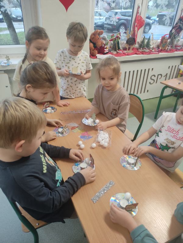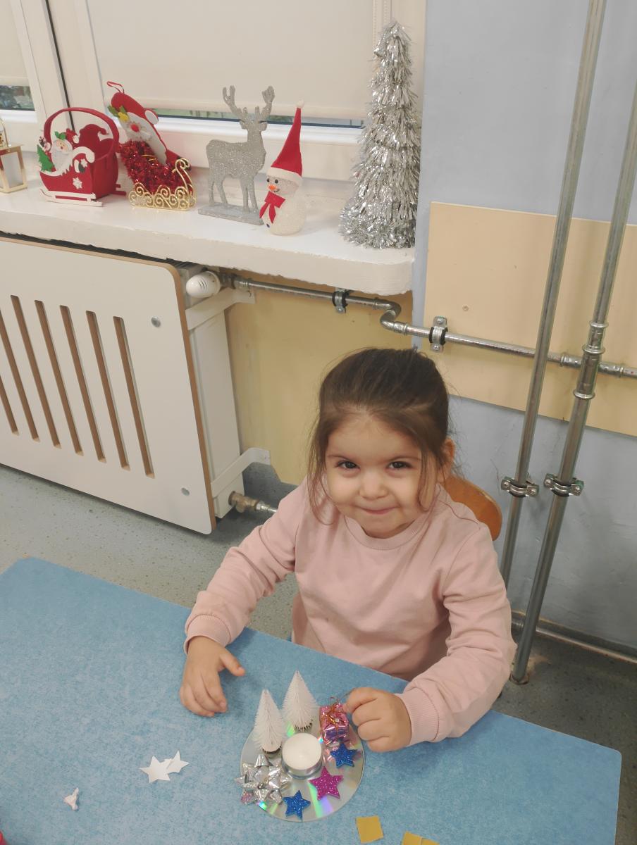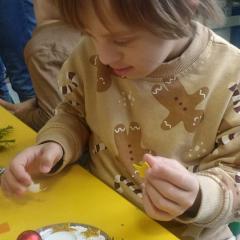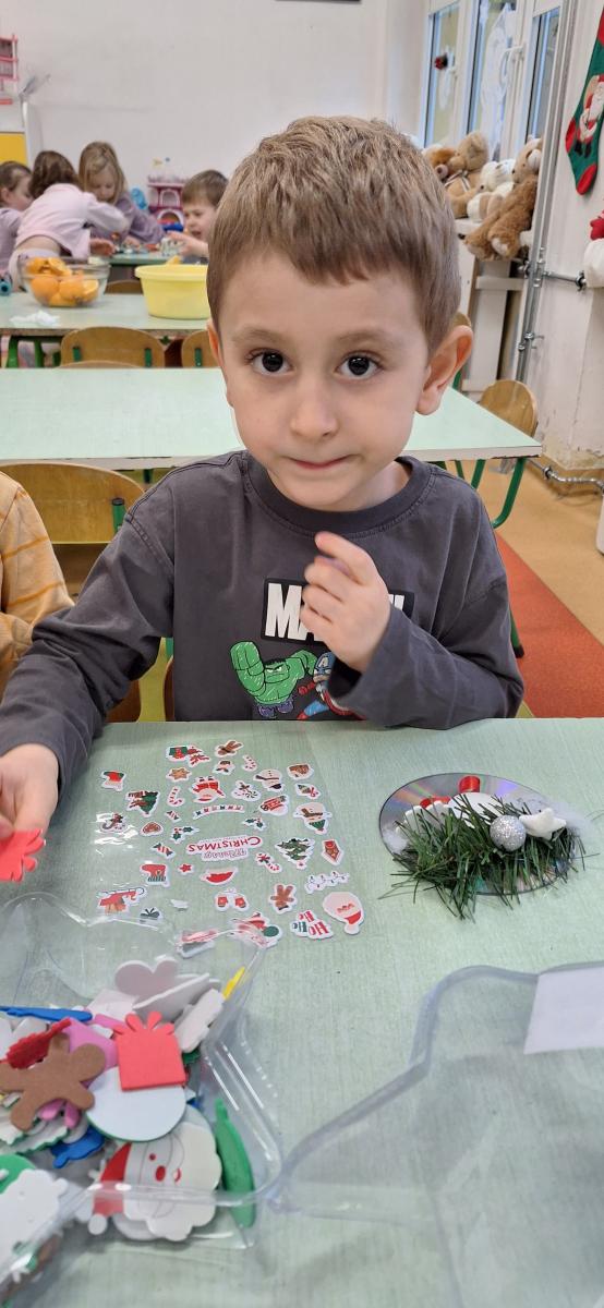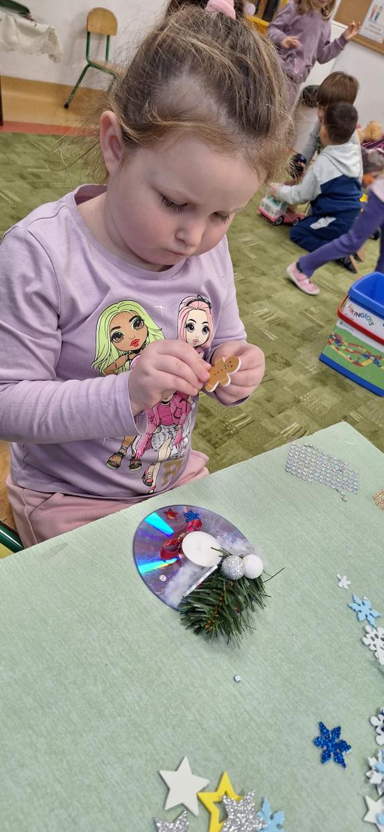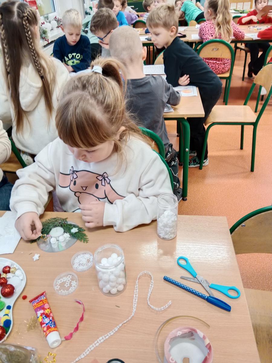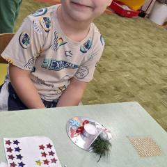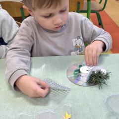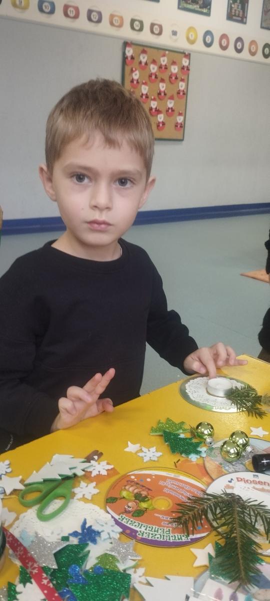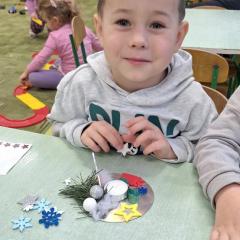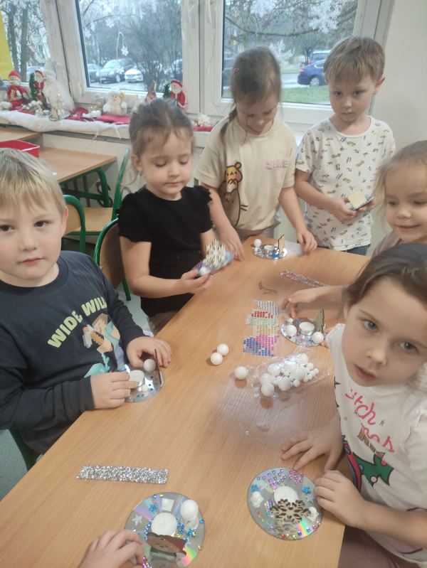 Święta Bożego Narodzenia to doskonała okazja, aby zaangażować dzieci do twórczego działania i wprowadzić je w magiczną atmosferę przygotowań do świąt. W dniu 09.12.2025 r., w ramach innowacji pedagogicznej „Świat małego artysty”, przedszkolaki wykonały świąteczny stroik, zaopatrzony w kolorowe wstążki, gałązki jodłowe i ozdoby. To była nie tylko okazja do rozwijania zdolności manualnych, ale także do wyrażania swojej kreatywności i indywidualności poprzez układanie elementów ozdobnych. Dzieci z zaangażowaniem i entuzjazmem dobierały kolorystykę, decydowały o rozmieszczeniu ozdób, tworząc małe arcydzieła świątecznej sztuki. Efekty pracy były wspaniałe, stroiki wypełnione były świątecznym blaskiem i magią.