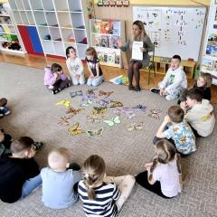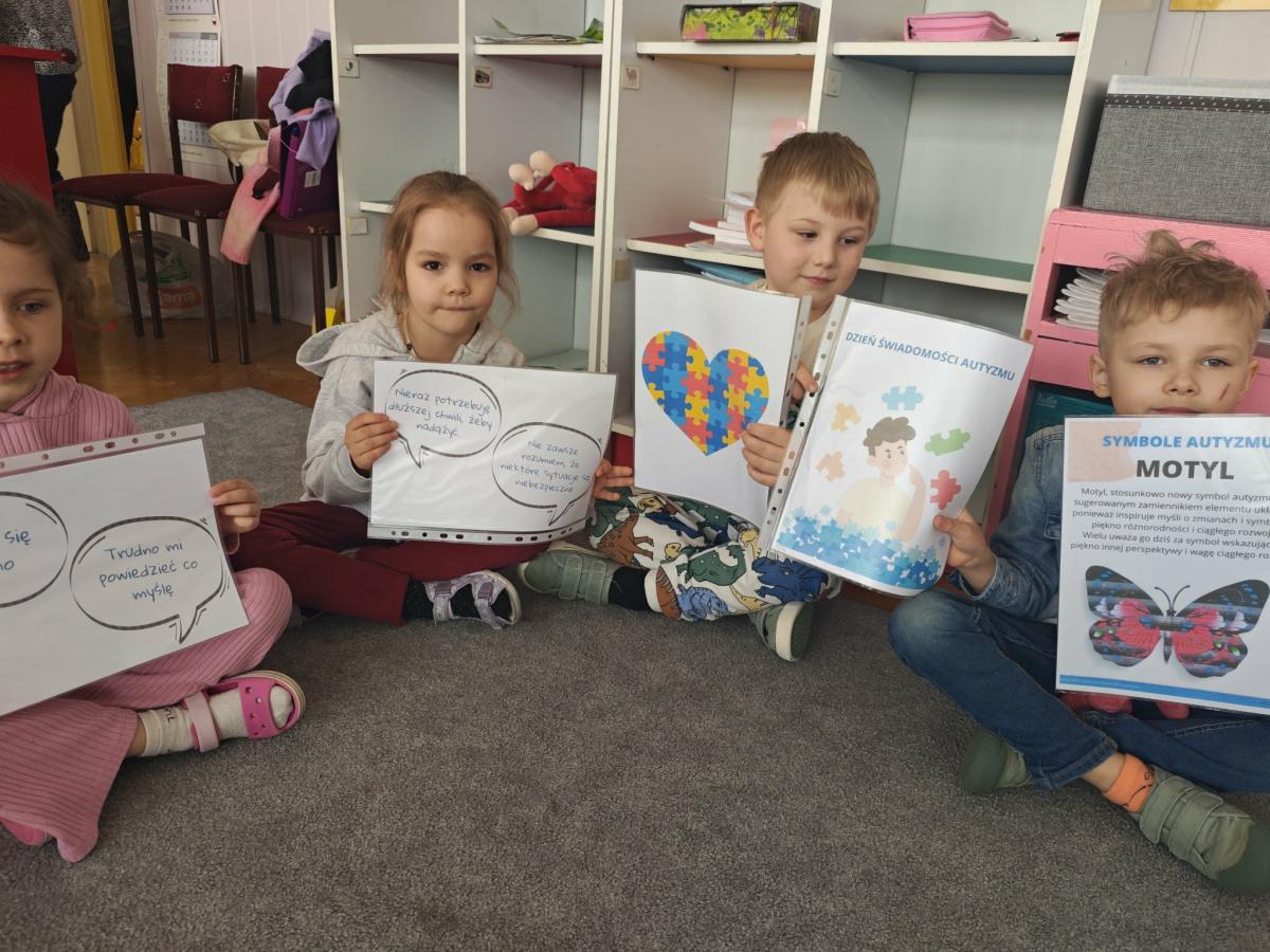 Jak to jest słyszeć „mocniej” lub widzieć świat „bardziej”? O tym rozmawialiśmy podczas Dnia Świadomości Autyzmu. Nasze przedszkolaki dowiedziały się, że spektrum autyzmu ma wiele twarzy, a osoby nim objęte mogą potrzebować więcej wsparcia w relacjach lub innej formy komunikacji. Analizując losy słynnych odkrywców i sportowców (m.in. Edisona i Messiego), dzieci zrozumiały, że neuroróżnorodność bywa źródłem ogromnej siły i talentu. Najważniejszym wnioskiem z zajęć było przekonanie, że życzliwość i otwartość na drugiego człowieka to klucze, które otwierają każde serce. Symbolem naszych zajęć stał się kolorowy motyl. Dlaczego właśnie on? Ponieważ każdy motyl jest inny, ma unikalne wzory na skrzydłach i własne tempo lotu, ale każdy jest tak samo zachwycający. Motyl symbolizuje piękno neuroróżnorodności – przypomina nam, że rozwój każdego dziecka może przebiegać inaczej, a naszą rolą jest stworzenie mu bezpiecznej przestrzeni, by mogło rozwinąć skrzydła.