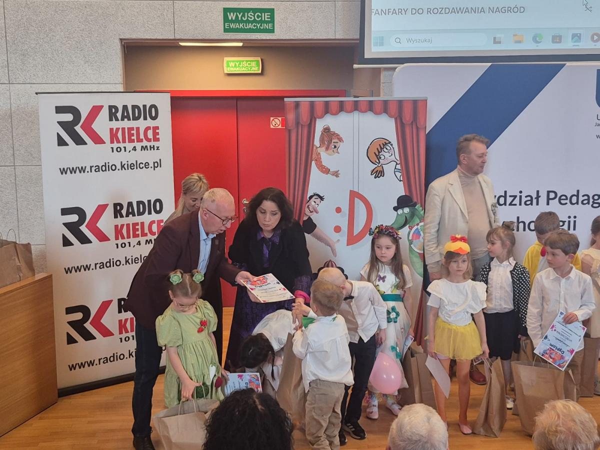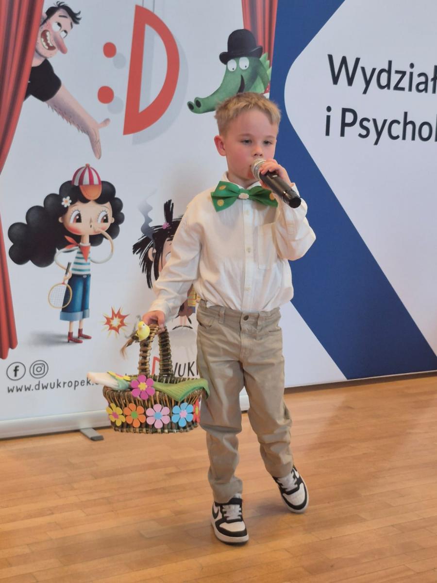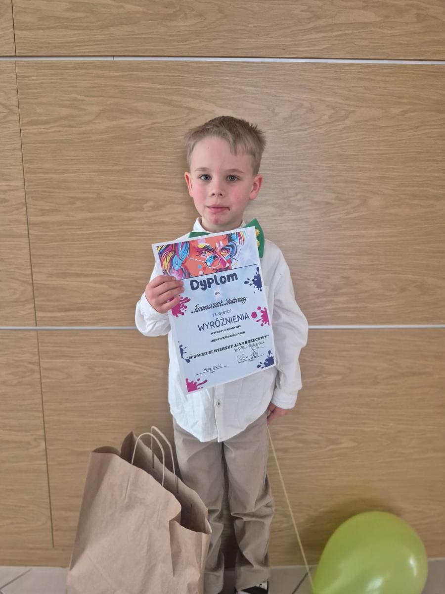 15 kwietnia 2026 r. w auli UJK odbył się konkurs recytatorski "W świecie wierszy Jana Brzechwy", zorganizowany przez Przedszkole Samorządowe nr 16 w Kielcach. W wydarzeniu wziął udział Franciszek S. z oddziału IV, który z dużym zaangażowaniem zaprezentował wiersz "Wiosenne porządki". Jego występ został nagrodzony wyróżnieniem, a także pamiątkowym dyplomem i nagrodą. Gratulujemy Frankowi sukcesu i życzymy kolejnych udanych występów!