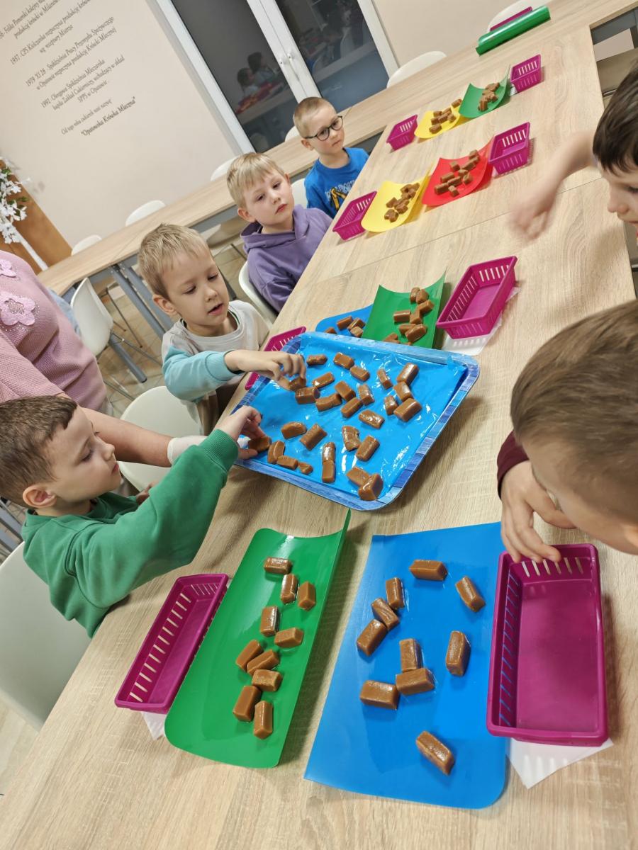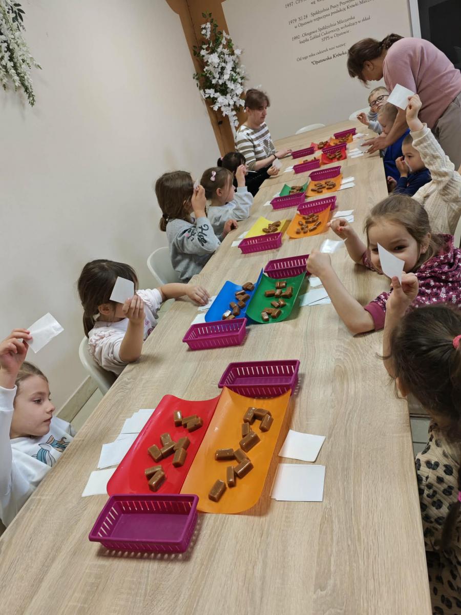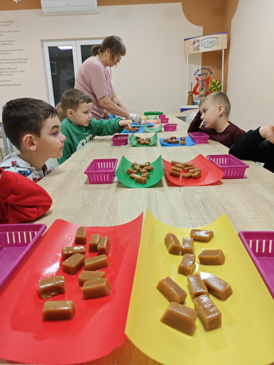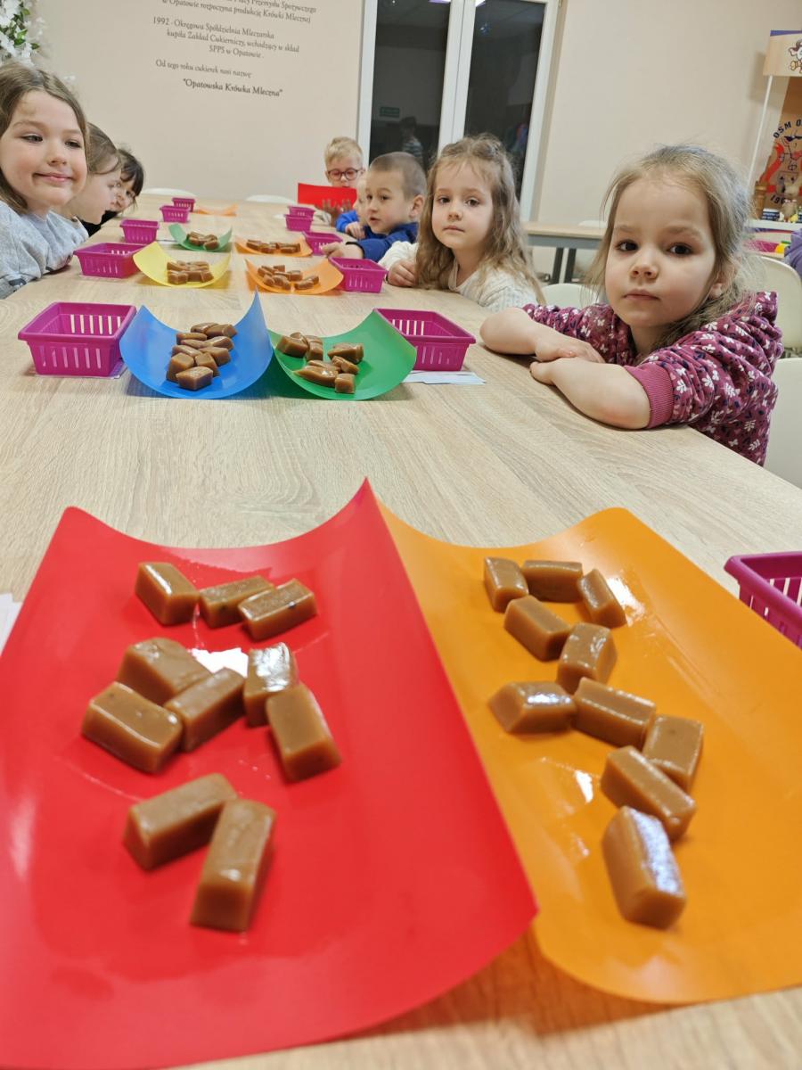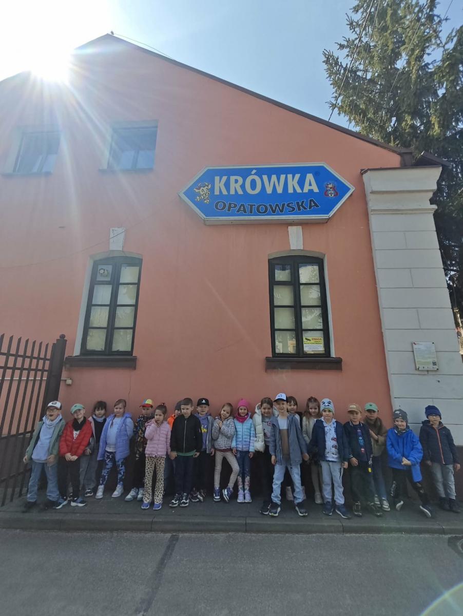 16 kwietnia dzieci z oddziału III wybrały się na wycieczkę do Krówkarenki - Kawiarenki w Opatowie. Celem wycieczki było poznanie etapów powstawania krówek, poznanie nowego zawodu oraz udział w warsztatach. Wycieczkę rozpoczęliśmy od obejrzenia pokazu multimedialnego oraz wysłuchania historii krówki opatowskiej. Dzieci poznały proces produkcji tych cukierków opanowały technikę ich zawijania. Miały również okazję do degustacji. Samodzielnie pozawijane i spakowane w specjalne kuferki słodkości nasze przedszkolaki mogły zabrać do domu. Po warsztatach przyszedł czas na obiad w restauracji "Zamiejska". Znalazła się również chwila na wspólne zabawy na placu zabaw. Pełni wrażeń, nowych doświadczeń, ze słodką niespodzianką wróciliśmy do domu.