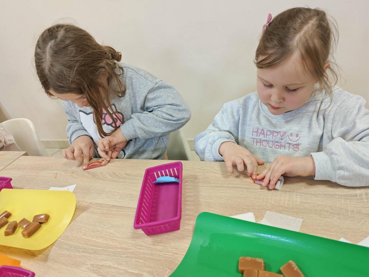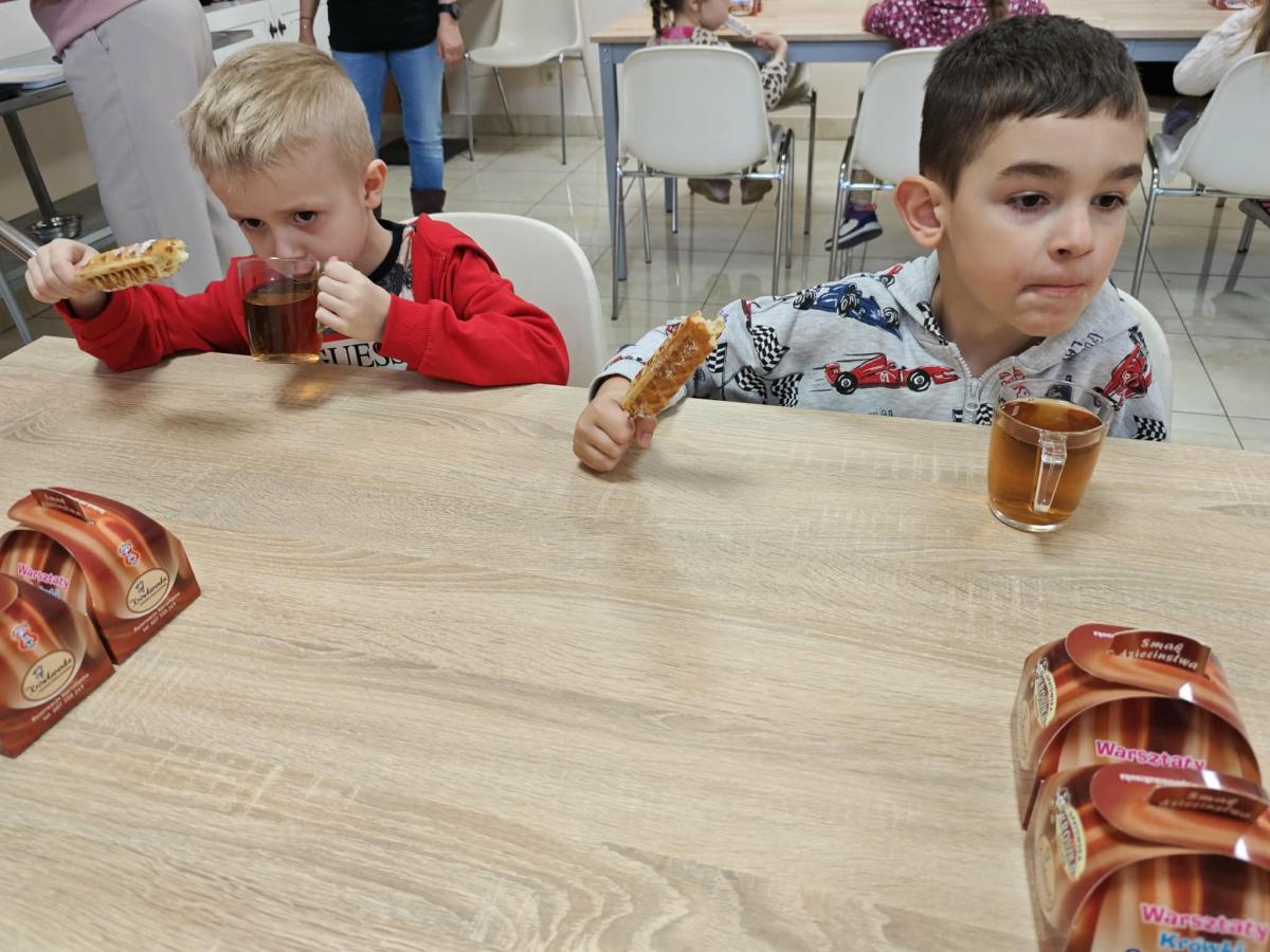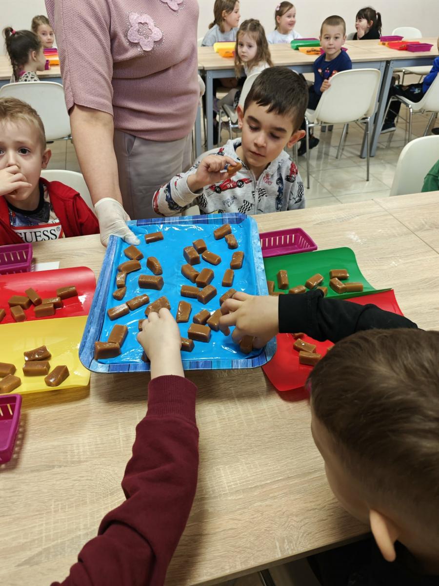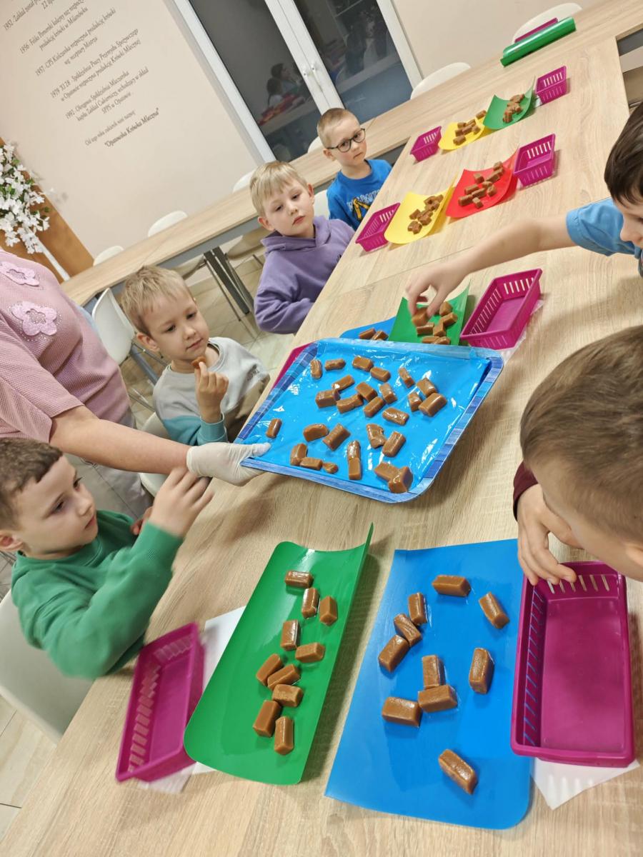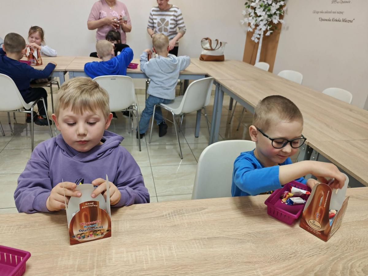 16 kwietnia dzieci z oddziału III wybrały się na wycieczkę do Krówkarenki - Kawiarenki w Opatowie. Celem wycieczki było poznanie etapów powstawania krówek, poznanie nowego zawodu oraz udział w warsztatach. Wycieczkę rozpoczęliśmy od obejrzenia pokazu multimedialnego oraz wysłuchania historii krówki opatowskiej. Dzieci poznały proces produkcji tych cukierków opanowały technikę ich zawijania. Miały również okazję do degustacji. Samodzielnie pozawijane i spakowane w specjalne kuferki słodkości nasze przedszkolaki mogły zabrać do domu. Po warsztatach przyszedł czas na obiad w restauracji "Zamiejska". Znalazła się również chwila na wspólne zabawy na placu zabaw. Pełni wrażeń, nowych doświadczeń, ze słodką niespodzianką wróciliśmy do domu.